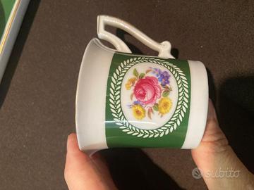 servizio da caffe in porcellana di Baviera finemente decorato con lussuosi motivi floreali e su uno sfondo verde che realizza un contrasto cromatico unico nel suo genere. il servizio è composto da due tazzine e una zuccheriera con piatto.