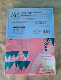 Parure Copripiumino Kids LA Dolce Casa- 100% Cotone - Bosco Rosa - Letto Singolo. Perfetto anche come idea regalo! 🎁 La fantasia è dolcissima: un paesaggio incantato con fenicotteri, pini e animaletti del bosco su un delicato fondo rosa. Realizzato in 100% puro cotone di alta qualità, morbido e traspirante. Il set include: 1 Sacco copripiumino (150x200) 1 Federa coordinata (52x82) ✅ Design Italiano ✅ Sistema con patella interna per bloccare il piumino ✅ Lavabile in lavatrice (colori resistenti)
