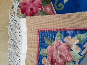 Lotto di quattro tappeti orientali di lana, probabilmente di provenienza cinese, con le seguenti dimensioni: due tappeti piccoli 70x140 cm (più 10 cm di frangia per lato); un tappeto medio 92x183 cm (più 10 cm di frangia per lato); un tappeto grande 170x260 cm (più 10 cm di frangia per lato). Ottime condizioni, non presentano tracce di tarme, si consiglia comunque un lavaggio prima dell'utilizzo. Preferibile il ritiro in zona; in caso di spedizione verranno realizzati due imballaggi distinti da 20 chili cadauno.