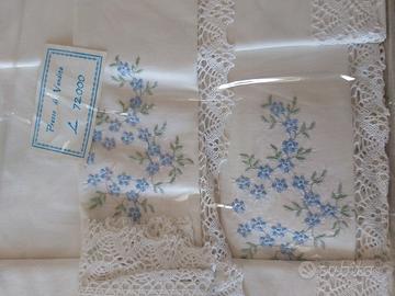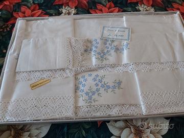 Vendo parure lenzuola matrimoniali, sopra e federe, nuove, nella propria scatola originale, mai usate, facenti parte del corredo "di una volta" causa inutilizzo. La marca è Bassetti, bianche con piccoli fiorellini azzurri e pizzo sfilato siciliano, 100% cotone. È presente ancora il prezzo originale pagato a fine anni 70/primi anni 80 di 72.000 lire. La confezione pesa 1,5 kg circa e le misure della scatola sono 60x37x4. Consegna a mano a Grugliasco (ritiro a cura dell'acquirente) o spedisco tramite servizio Tuttosubito. A disposizione per ulteriori foto.