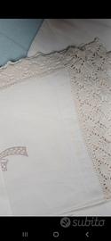 Bellissimo lenzuolo matrimoniale (solo il sopra) * cm 230x246 * con dettagli in pizzo e ricami, (qualità artigianale anni '80) con due federe *74x48* provviste di asole (bisogna attaccare i bottoni). Colore ecru, con dettagli di ricamo in filo più chiaro/scuro e bianco, probabilmente cotone.