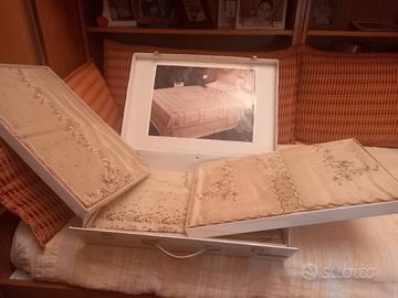 Parure completa matrimoniale in puro cotone, lenzuola sotto e sopra, due federe e copriletto, nuove mai usate, in confezione valigetta originale