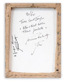 Certificato di autenticità a cura dell'Artista recante etichette delle esposizioni tenutesi a Lugano e