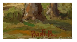 Questa opera firmata M. Pasotti rappresenta un viandante solitario che attraversa un sentiero di campagna, immerso in un paesaggio agricolo silenzioso e spoglio. Le tonalità calde della terra, la struttura compositiva equilibrata e il taglio narrativo semplice ma evocativo rimandano a una pittura attenta al quotidiano e ai ritmi della vita rurale. L'artista mostra una chiara predilezione per i soggetti contadini e popolari, come confermato anche dalla realizzazione di una copia delle Spigolatrici di Jean-François Millet — uno dei capolavori assoluti del realismo sociale ottocentesco. Questo collegamento evidenzia l’interesse di Pasotti per il mondo agricolo non solo come ambiente fisico, ma come scenario umano e simbolico, fatto di fatica, dignità e silenziosa perseveranza. Confrontando questo dipinto con la copia delle Spigolatrici di Millet, emerge una poetica coerente e una precisa sensibilità tematica. In entrambe le opere, Pasotti si concentra su soggetti umili e contadini, rappresentati con rispetto e senza retorica. L’interesse non è tanto per l’evento, quanto per la condizione: il gesto quotidiano, il legame tra l’uomo e la terra. La coerenza tematica tra questa opera e la copia di Millet rafforza l’ipotesi di un percorso artistico focalizzato su scene agricole e sulla dignità della vita semplice, collocando M. Pasotti in quella vasta produzione di autori capaci di raccontare il mondo contadino con autenticità e sensibilità. L’artista lavora con una gamma calda e terrosa, tipica della pittura contadina: ocra, bruni, verdi e azzurri polverosi. Il tratto distintivo dell’artista risiede nella pennellata ampia e corposa, visibile, lasciata libera sulla superficie del dipinto per costruire le forme, più vicina alla pittura "a macchie" che al disegno dettagliato. Le campiture di colore non sono perfettamente levigate: restano visibili le tracce del pennello, con passaggi rapidi e decisi che danno movimento alla superficie pittorica.