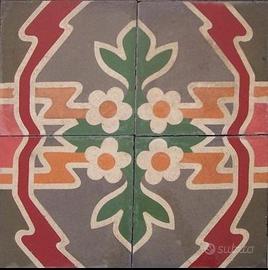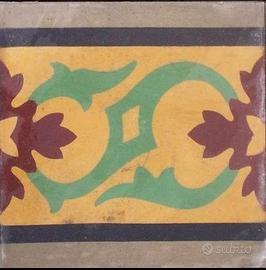 Pavimentazione di cementine d'epoca composta da n. 44 pz greca e n. 100 pz trama interna alla greca. il formato del mattone è cm 25x25. Lo spessore misura cm 2 / 2,2 cm. La superficie totale è di 9 mq (foto 3). Disponiamo di mattonelle d'epoca in tinta unita per eventuale bordo perimetrale (foto 1. foto 7). La nostra azienda è situata in prov. di Benevento. Spediamo in tutta Italia in 7/10 gg.
