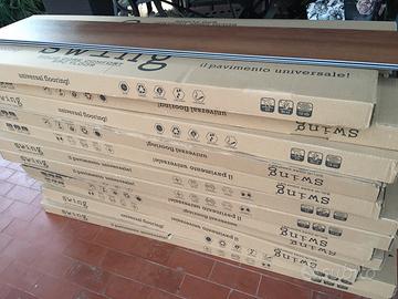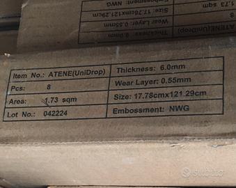 Vendo 8 pacchi di lastre SPC (pavimento flottante) per complessivi 14 mq circa di pavimento finto parquet di alta qualità colore noce medio. Nuovo, ancora imballato, pagato 38 euro/mq, vendo per cambio progetto. Ciascuna lastra ha dimensione 121,29 x 17,78 cm e spessore 6 mm. Altre caratteristiche in foto. Già con tappetino incorporato. Si tagliano facilmente e si assemblano in un attimo, basta una manualità minima. In 2/3 ore ricopri il vecchio pavimento e guadagni in igiene ed isolamento acustico. Non spedisco. Ritirabili in Roma zona Vitinia.