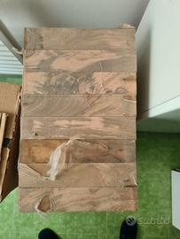 Parquet in olivo massello nuovo. Sono 9,5 pacchi da 1,6 mq l'uno, per un totale di 15mq. I listelli misurano 5 x 25 cm e sono alti 10mm.