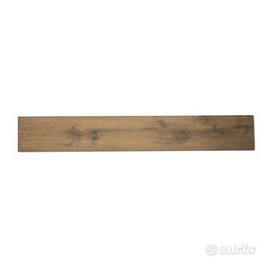 Pavimento PSC flottante color legno rovere scuro. Ogni pannello misura 1,22x0,18 m.