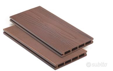 Pavimento wpc decking, per esterni, in doghe, Spessore 21/25 mm., Mis. 140/150x2000 mm., superficie liscia, venata o spazzolata, con resistenza allo scivolamento, colori beigè, marrone, grigio, blu, bianco.