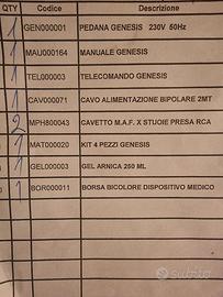 pedana genesis nuova,mai utilizzata...con fattura di acquisto pari ad euro 3450.. la pedana e completa di quello che si vede in bolla di acquisto.. la pedana serve per la magnetoterapia,ultrasioni,ed elettrostimolazione...