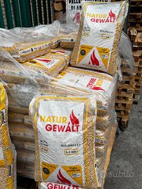 Pellet Natur Gewalt certificato ENplus A1, diametro 6 mm. Parametri dichiarati: contenuto idrico ≤ 6,0%, ceneri ≤ 0,35%, potere calorifico ≥ 4,9 kWh/kg. Accensione pronta, fiamma stabile e poca manutenzione.