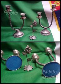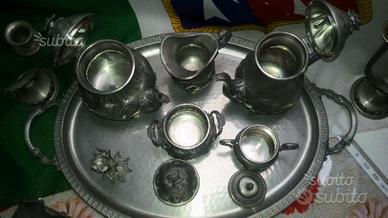 Per collezionismo, antiquariato,Occasione vintage anni 50 /60....servizio da the/caffetteria/infusi.. completo di cestino portadolci,marcati " puro peltro " o " 95% peltro"...per un totale di 7 pezzi. ...regalo in omaggio ...coppia di artistici candelabri a 2 fiamme (argentati ) e piccola rosa con livrea coeva. . di buon auspicio