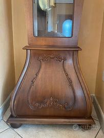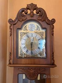 Bellissimo pendolo anticato in noce intarsiato, parti del meccanismo in ottone dorato, si carica a mano ed ha autonomia di circa 8 giorni, no batteria, suona ogni quarto d'ora e i rintocchi di ogni ora ma volendo si può togliere la suoneria. Misura circa 2 mt. di altezza 55 cm larghezza e 50 cm profondità. Ottime le condizioni sia del mobile sia del meccanismo