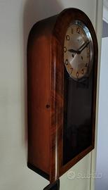 Orologio a pendolo da muro in radica e vetro databile anni 40. Perfettamente funzionante con carica da circa 8 giorni. Completo di chiave originale.