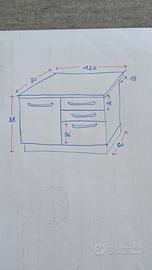 Tre cassetti: due piccoli di cui uno completo di porta posate su misura originale, uno alto e profondo per pentole molto comodo.