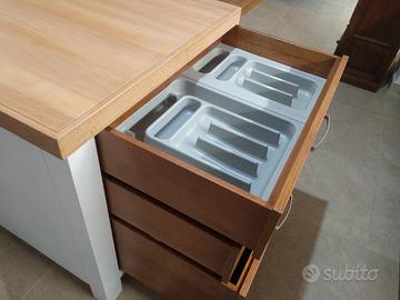 penisola costruita in listellare ricoperto di rovere spazzolato suddiviso come da richiesta del cliente in 2 lati sfruttabili metà con cassetti e metà con ripiani a giorno e piano di appoggio sulla metà della lunghezza con misura 180 prof. 80 h 90 suddiviso in un blocco da 90 da una parte con 3 cassetti su guide ammortizzate in chiusura con maniglie cliente (2 piccoli con porta posate e 1 grande) mentre dall'altra parte vano a giorno con 3 ripiani con prof. circa 30 cm chiuso con schienale. struttura in listellare e gamba di sostegno parte a sbalzo con top in massello di rovere da 5 cm con ferri sottostanti incassati in modo da tener fermo il piano che non si muova. finitura laccata rall 9010 su scocca mentre il top frontali cassetto finitura lucidata ciliegio come da mobile già in possesso. Completo di tagliere in faggio per impasto con misura 90 x 90 circa con bordi laterali in modo che non si muova sul piano. Prezzo compreso finitura franco fabbrica iva non comprendente. costruito su commissione ed esigenze del cliente, non è disponibile a magazzino ma essendo i diretti produttori falegnami possiamo riprodurlo uguale o in base alle proprie esigenze. per domande o dubbi contattateci P.S. disponibili a dare suggerimenti o chiarimenti in merito, per noi conta dare vita al vostro sogno DIRETTAMENTE DAL PRODUTTORE ASTENERSI RIVENDITORI O COMMERCIANTI