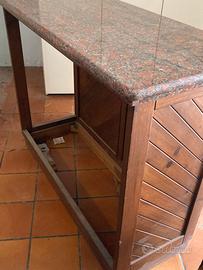 Mobile artigianale con piano in granito rosso usato come penisola perché aperto su due lati con funzione di mobile bar. Mancano le mensole interne.