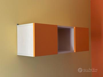 Vendo pensile a tre vani, perfetto per la cameretta di bambini o ragazzi. Realizzato con materiali solidi e resistenti, offre un’ottima capacità di contenimento grazie ai due vani laterali con anta arancio e al vano centrale aperto.