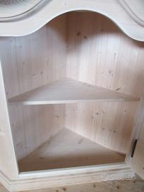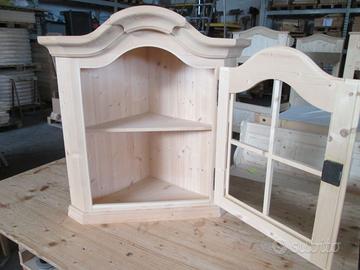 Pensile ad angolo in abete rosso massiccio altezza 74cm, prof 46 cm con 1 anta, 1 ripiano interno e base piana, senza vetro. ULTIMI PEZZI