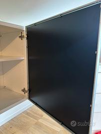 Pensile Ikea in legno con anta in vetro che può essere sfruttata senza pannello oscurante per vedere all’interno e quindi espositivo , oppure con pannello bianco o nero che non lascia l’interno visibile . È possibile anche applicare poster o foto tra lo spessore in vetro e il pannello , trasformando cosí ogni pensile in opera d’arte o cornice contenitiva.