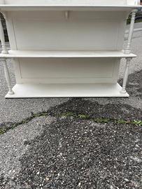 Vendo elegante pensile a giorno in legno verniciato bianco opaco, ideale per amanti dello stile Shabby Chic, Provenzale o Classico. Il mobile è caratterizzato da raffinati montanti torniti e una struttura robusta con schienale pannellato. Caratteristiche: Struttura: 3 ampi ripiani a giorno (piattaia). Dettagli: Colonne laterali tornite e ganci superiori già predisposti per il fissaggio a parete. Versatilità: Perfetto come porta spezie/piatti in cucina o come libreria sospesa in camera o studio. Dimensioni : Mensola 103larghezza. Altezza 74, profondità 25 Condizioni: Usato in buone condizioni generali. La finitura bianca presenta una leggera patina vissuta che ne esalta lo stile. Struttura solida e pronta per essere appesa.
