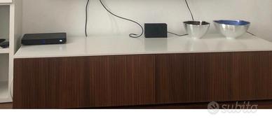 Vendo elegante parete TV completa composta da: 2 pensili sospesi (cornice sopra TV) mobile basso porta TV effetto legno ✔ Condizioni: pari al nuovo, usata pochissimo ✔ Design moderno (bianco opaco + finitura legno) ✔ Struttura solida e capiente ✔ Ideale per TV di grandi dimensioni e soggiorni moderni Misure: Pensili (cadauno): 90 cm lunghezza – 38 cm altezza – 33 cm profondità Mobile basso: 180 cm lunghezza – 52 cm profondità – 36 cm altezza