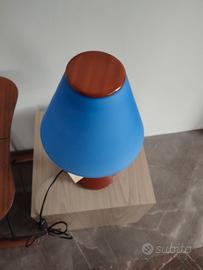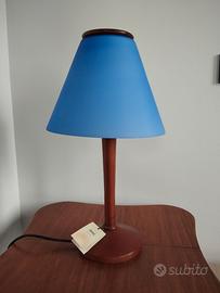 Lampada da tavolo modello Lolly con struttura in legno massello, paralume in vetro soffiato esterno blu interno bianco alta cm 47 diametro paralume cm 25