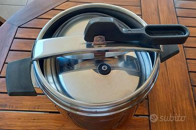 Vendo pentola a pressione Lagostina 7 litri, in acciaio inox per passaggio a piano induzione. Diametro 22 cm. In dotazione anche un cestello inox per la cottura a vapore. Tutto in ottime condizioni. La pentola è interamente in acciaio inox e può essere utilizzata per cucinare anche come pentola tradizionale senza il coperchio che la rende a pressione.