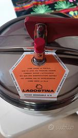 Pentola a pressione Lagostina in acciaio - Manico rosso. Mai usata, libretto istruzioni presente, manca però la scatola. In regalo libro di ricette
