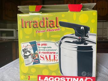 Pentola a pressione *Lagostina modello Irradial da 7 litri*, in acciaio inox, usata pochissimo e *in perfette condizioni*, completa di *scatola originale* e *ricettario incluso*.