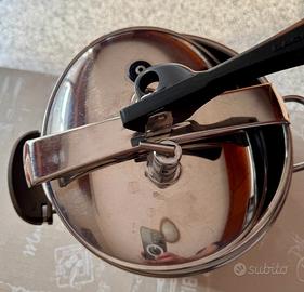 Pentola a pressione Lagostina in acciaio Inox 18/10 con classico coperchio flessibile con chiusura ermetica e valvole di esercizio a due scatti e valvola di sicurezza. Ottime condizioni estetiche senza bruciature, con la guarnizione ancora morbida. Compatibile solo per piani cottura a Gas. Capienza nominale commerciale 7 litri, volume effettivo 6,3. litri. Diametro 20 cm, altezza 20 cm.