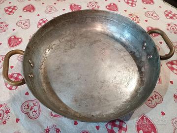 Pentola Agnelli in Rame Baldassare, 37 cm di diametro, 7,5 di altezza, peso 3Kg, buona condizione generale, la stagnatura è ancora buona.