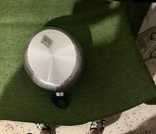 Realizzata in alluminio con rivestimento interno nero antiaderente e corpo esterno con finitura effetto pietra grigia.