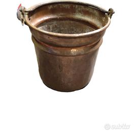 Splendido secchio antico in rame con robusto manico in ferro battuto, ideale come oggetto decorativo per ambienti vintage, rustici o industriali. Realizzato interamente in rame massiccio con manico originale e ganci lavorati a mano, presenta la tipica patina del tempo che ne esalta il fascino autentico.