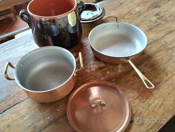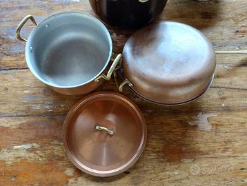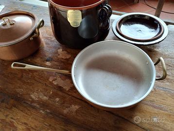 Cedo in blocco perché doppioni una pentola in coccio con coperchio nuova da rinnovare, diametro cm 22 altezza cm 24, con interno smaltato (riporta ancora l'etichetta che consiglia l'immersione in acqua fredda per 12 ore prima del primo utilizzo), una pentola con relativo coperchio in rame e manici di ottone di 23 cm di diametro per 10,5 di altezza e un'altra con manico lungo in ottone di cm 27,5 di diametro. Entrambe queste due hanno l'interno zincato e non sono di nuova produzione, sebbene siano in perfette condizioni. Risalenti probabilmente agli anni 50/60. Preferibile ritiro di persona