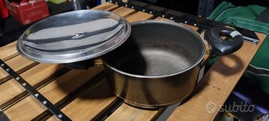 Per inutilizzo, vendo pentola, tipo casseruola, in alluminio, antiaderente, 18 cm, 2 manici rivestiti in plastica, marca COOP, colore scuro, ancora utilizzabile ed in condizioni discrete, come da foto allegate. Includo nel prezzo un coperchio.