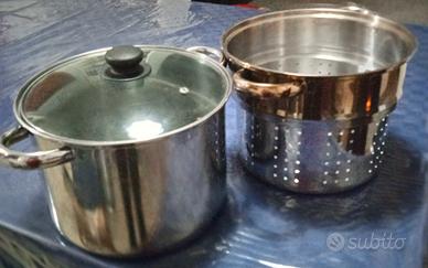 Pentola cuocipasta (pastaiola). PENTOLA CON CESTELLO ideale per bollire la pasta o lessare le verdure. Comoda e pratica per l’uso quotidiano, lavabile in lavastoviglie. Acciaio inox coperchio in vetro con valvola di sfiato. Parte superiore del cestello ambrato per il calore. Altezza cm. 16 Diametro cm. 22