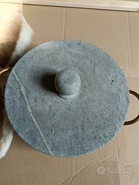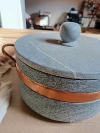Pentola di pietra ollare 22cm, con manici e cerchio in rame. In perfette condizioni, mai usata.