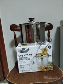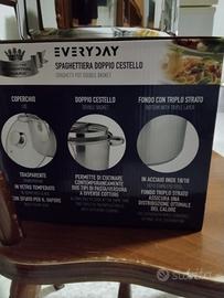 Pentola in acciaio inox 18/10 con coperchio trasparente in vetro temperato, adatta a tutti i piani cottura anche induzione, e foro di sfiato, con due cestelli estraibili per due diversi tipi di cottura e manico. Nuovo