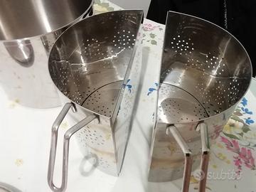 Pentola in acciaio inox 18 /10, con doppio scolapasta per cucinare due diversi tipi di pasta. Con coperchio. Marca balzani. Misura h cm. 17, circonferenza cm 24.