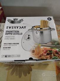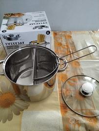 Pentola in acciaio inox con coperchio trasparente in vetro temperato con valvola di sfiato per tutti i piani cottura, misura 6 Litri, con cestelli estraibili per due diverse cotture e manico. Nuovo
