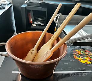 Pentola in rame di alta qualità con fondo adatto ai piani a induzione, mai usata (nuova). Ideale per una cottura uniforme e professionale. Dotata di manici robusti e completa di utensili in legno abbinati, perfetti per non rovinare le superfici. Adatta sia per cucina domestica che ristorazione, ottima per preparazioni tradizionali. Venduta completa di accessori.