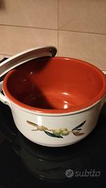 Elegante pentola in terracotta, perfetta per la tua cucina. - Decorata con un motivo di olive. - Finitura esterna bianca con dettagli colorati.