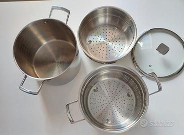 Pentola acciaio inox Moneta 24 cm. 8 lit. con cestello scolapasta e cestello per cottura a vapore. Coperchio in vetro. Adatta a tutti i piani cottura, indicata per induzione.