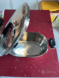 Pentola ovale con coperchio a scolapasta ideata da Paolo Petroni, perfetta per la cottura della pasta lunga (e non), verdure, pesce, aragosta, pollo, zampone e cotechino. Dotato di cucchiaio dosa sale e per l’assaggio dello spaghetto, oltre che il manuale d’uso. Nuova, in perfette condizioni poiché non è mai stata utilizzata.