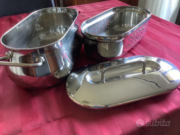 Vendo pentola ovale in acciaio, misure 40 cm x 20 cm in altezza. Adatta per la cottura del pesce intero anche a vapore o per arrosti e rolate
