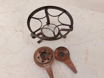 fondo in acciaio. La pentola è in rame con il manico in legno ed è fornita di sei forche lunghe.