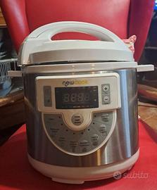 Pentola programmabile NewCook Delicious, elettrica con voce, 15 funzioni, 1000 watt, capacità 6 litri, 4 livelli di pressione, vasca in ceramica, accessorio per friggere. Cucina tutti i tipi di ricette nel modo più veloce sicuro e pulito fino a 12 persone. Ideale per cucinare al vapore stufati, fritti, dessert, riso, pasta. Permette di programmare tempo temperatura e pressione manualmente.