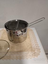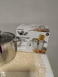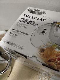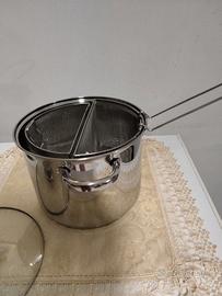 Pentola spaghettiera in acciaio inox induzione e adatta anche a tutti i piani cottura , 6 litri, con coperchio trasparente in vetro temperato, e due cestelli estraibili, manico , adatti a per due tipi di cottura contemporanei.