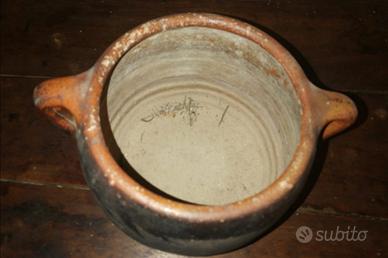 Pentola vaso di terracotta d'epoca, storicamente utilizzata per la cottura lenta su fuoco aperto o stufe.